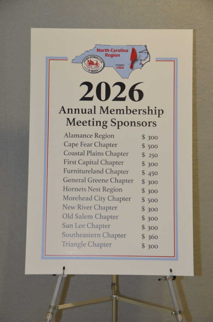 – Two North Carolina Region shows, Spring and Fall, where members enter to have their vehicles judged for awards.